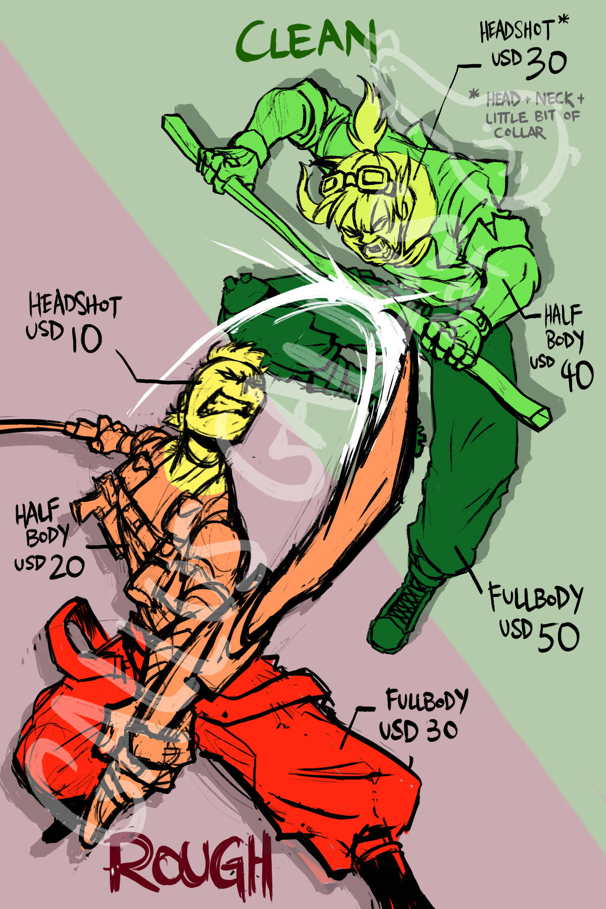 | Clean Sketch | $30 (Bust) | $40 (Halfbody) | $50 (Fullbody) |